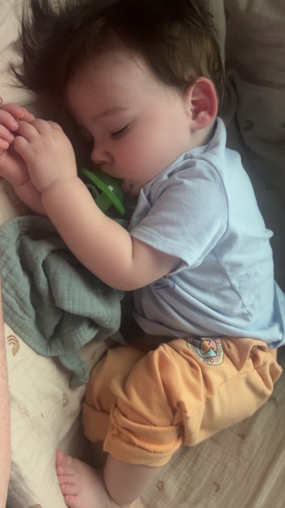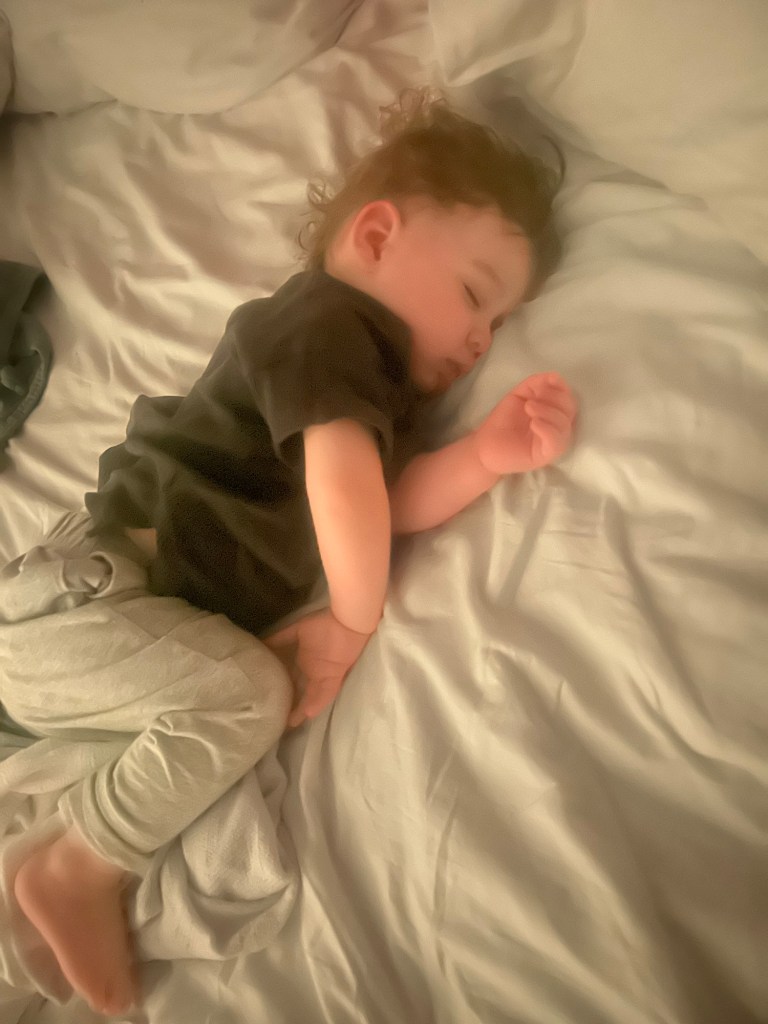 We hit the road at 5 AM, and thankfully, our little man snoozed peacefully until our first stop—Buc-ee’s, aka the land of brisket, beaver nuggets, and reckless spending. I had packed a travel mattress designed for a pack-n-play (lifesaver!), which I wedged onto the seat with my diaper bag to create a makeshift sleep/play zone. We originally tried one of those inflatable toddler airplane beds, but it was a complete fail—like trying to fit a square peg in a round hole.
