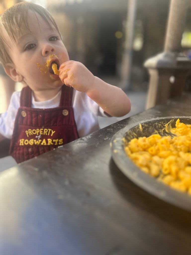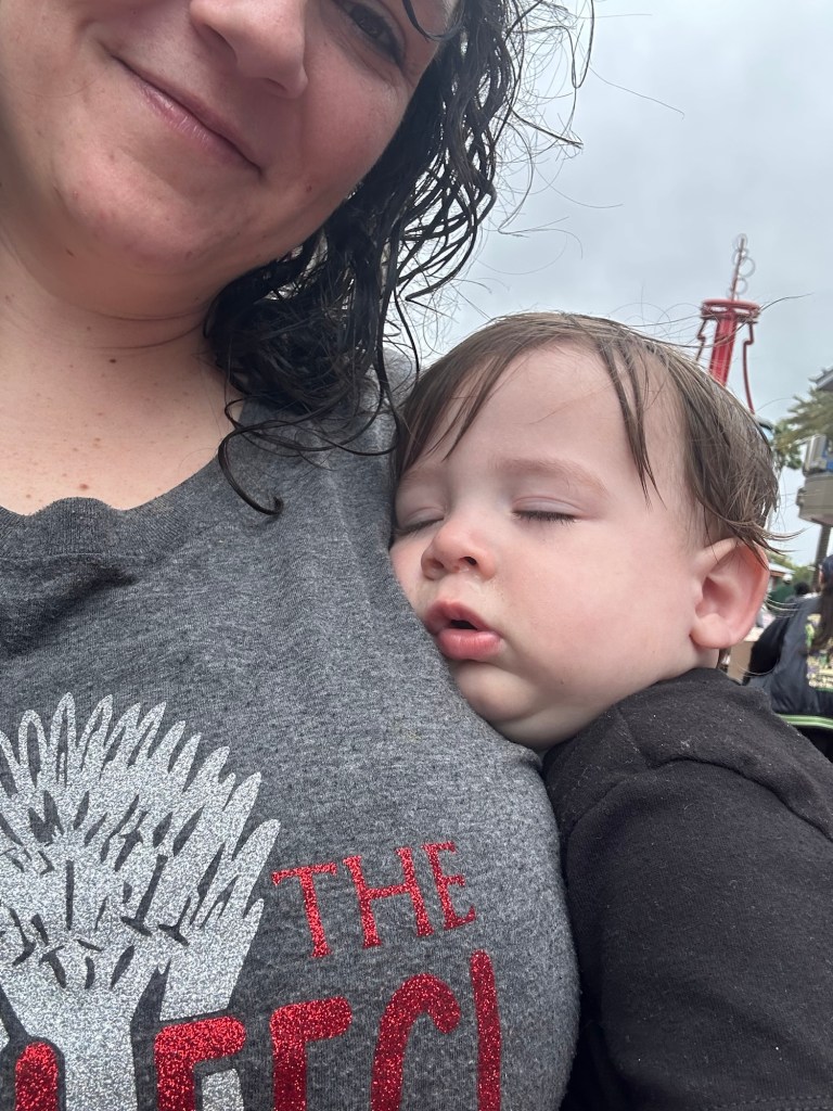 We had lunch at The Three Broomsticks (he had mac and cheese, mashed potatoes, and chicken), and then he and I headed back for a nap. He crashed before we even got to the gate. Here’s where things got tricky—my sit-and-stand stroller requires two hands to fold, and my husband had to stay with students. So, I somehow managed to hold my sleeping toddler on my Tush Baby, push the stroller, and pray for human kindness. Thankfully, a bus driver stepped in to help—shoutout to humanity!