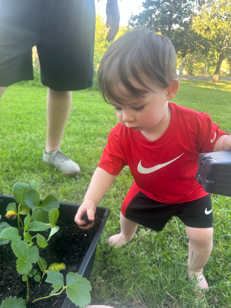 He’s picking it up faster than I expected. From sweeping the grass out of the yard (where it clearly does not belong), to making sure Mama’s strawberry bed isn’t too bold, to standing guard over the produce beds like a dirt-covered bouncer keeping nosy puppies in check—it’s just another day on the job for this tiny farmhand.