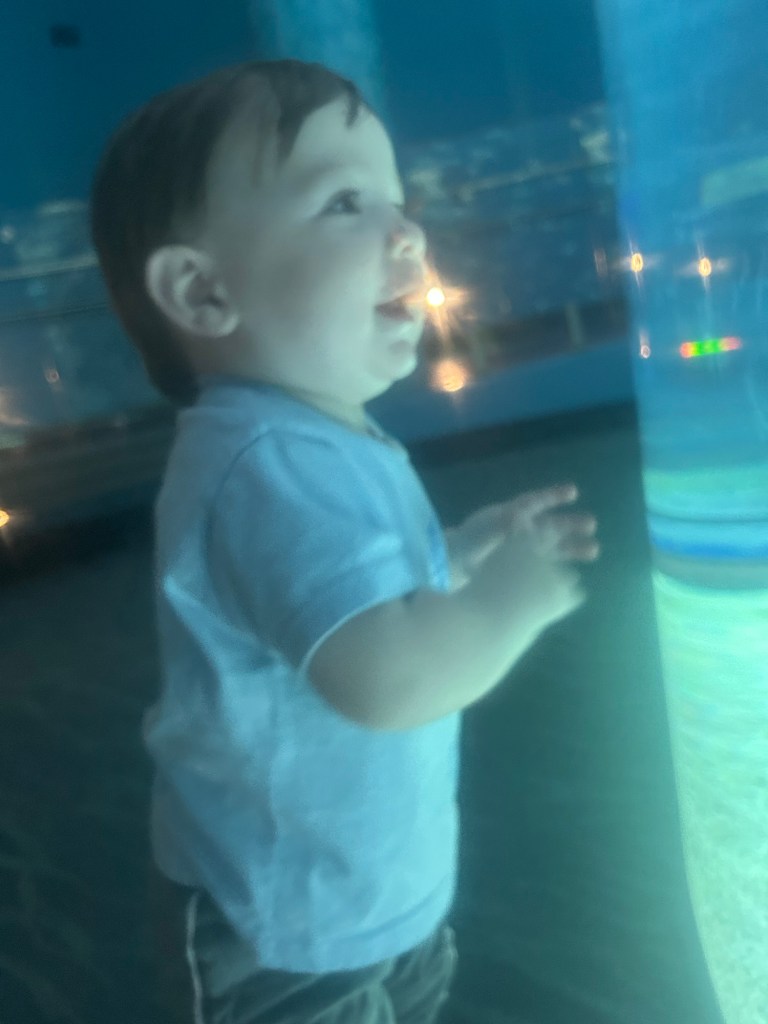 We began at the touch pool, where Coop watched me stick my hand in and then—hesitantly—followed my lead. That is, until a ray swam by, and he yanked his hand out like it was lava. 😂 Still, he was fascinated and watched the tank for a good 20 minutes.