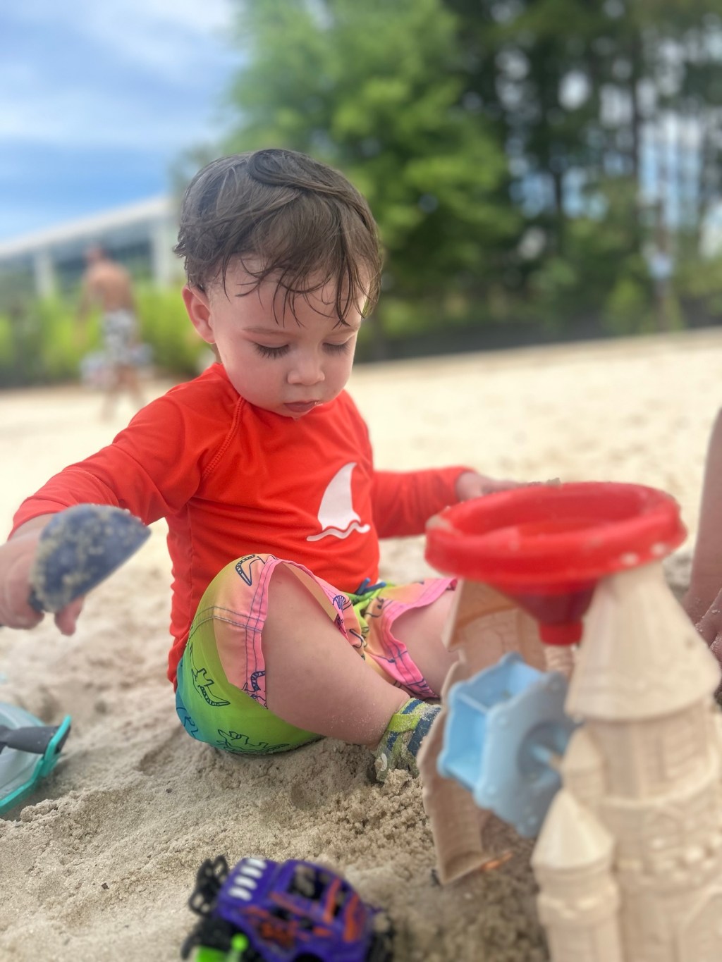 Back at the beach, Coop played hard in the sand, chugged water like a champ, and munched on a Skout peanut butter and jelly bar. Then came our brave moment of the day: letting him wade in the water without a float. Only in the shallow, and with all hands on deck. He loved it. We had to carry him away kicking, grinning, and dramatically shouting, “No no no no no!” He eventually surrendered—exhaustion wins every time.
