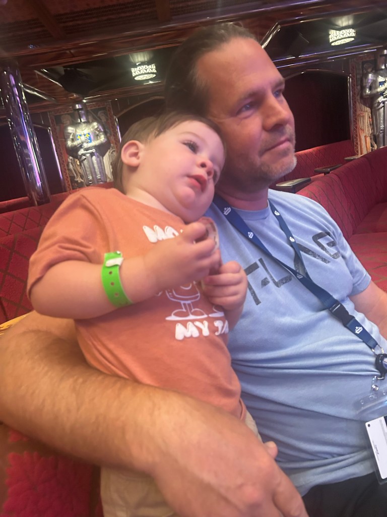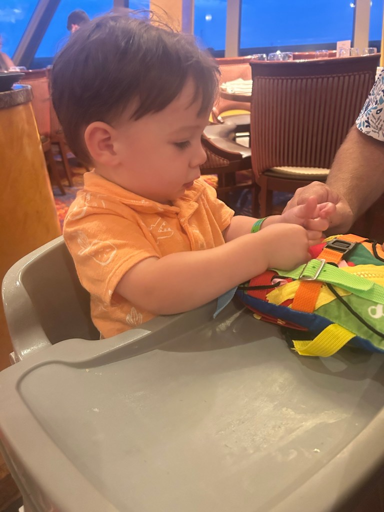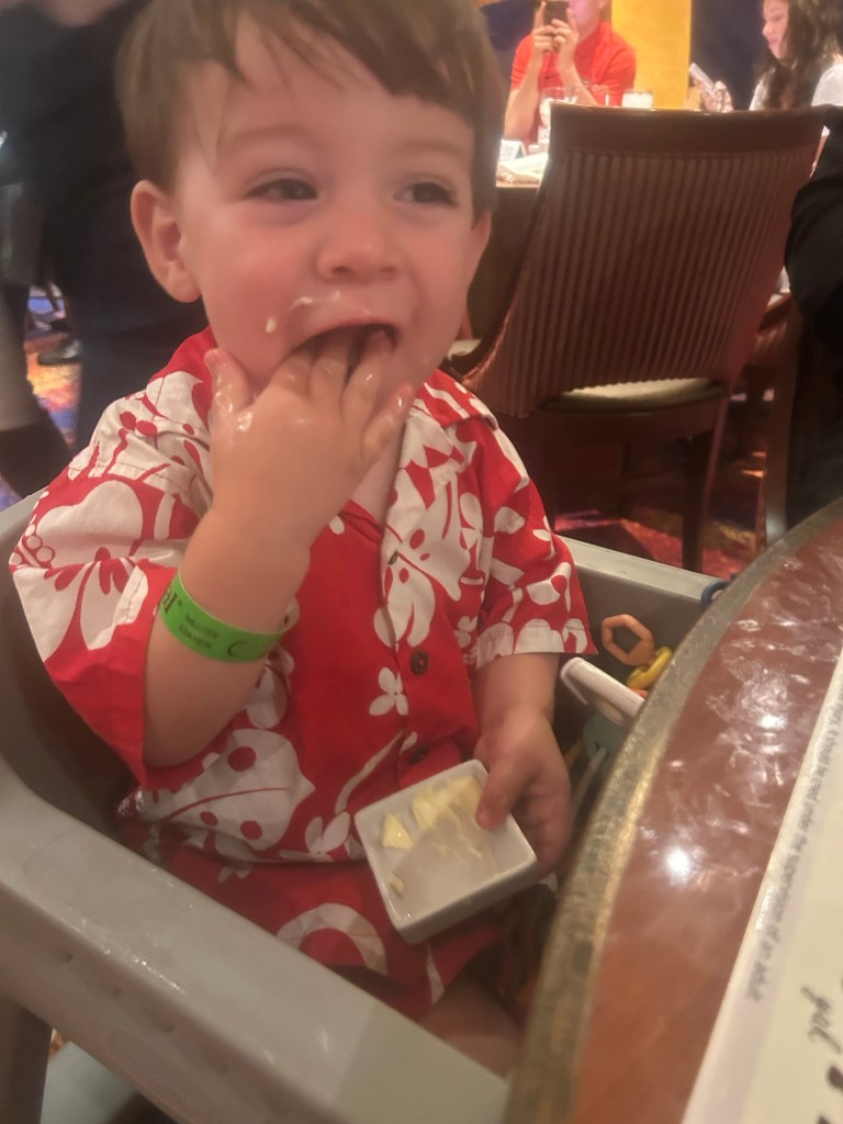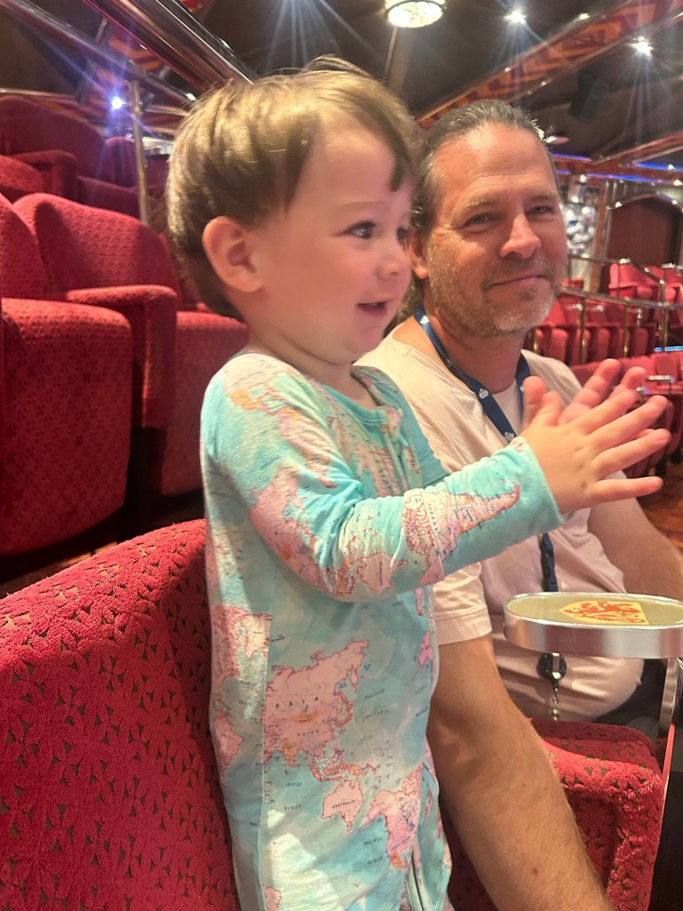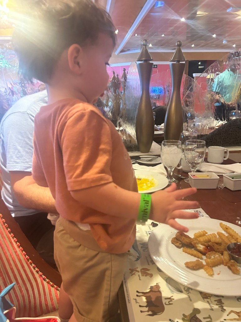 We booked late dining at 8:15 because it fit his schedule at the time. By cruise week, he was a one-nap kid and that dinner was way too late. He gave it his best, but most nights one of us had to leave the table early. One night he even slept on me through almost all of dinner. For the next cruise, we know early dining is the way to go.