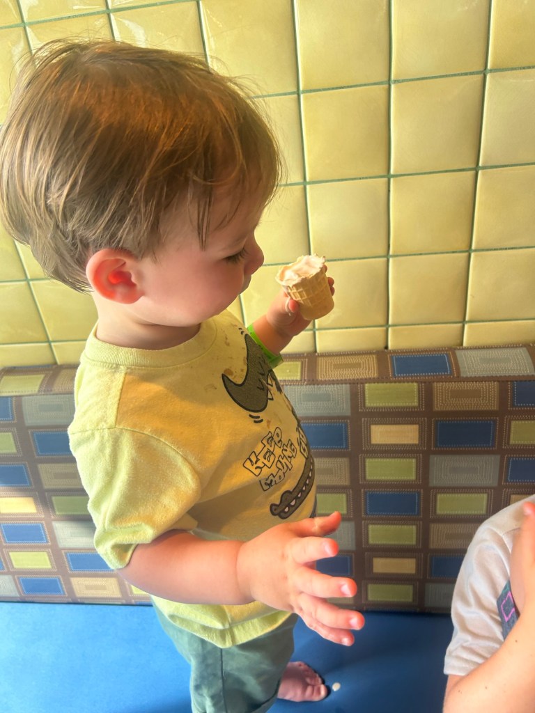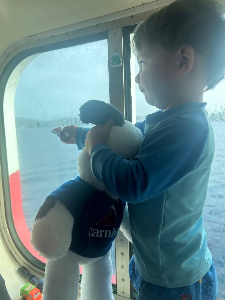 That first half day was a bit stressful with the crowds and excitement. Coop wanted down to explore, but crowded ship areas made it hard. We grabbed some pizza and let him stretch his legs in the back of the ship where he could watch the water. He bumped his head a few times but had the best time.