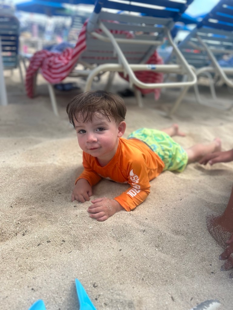 We skipped excursions and went to the free beach. It was crowded but good for us. We forgot his life vest, but Patrick rented one. Coop splashed, played, and then switched to sand time while we snorkeled with Lolli’s help.
